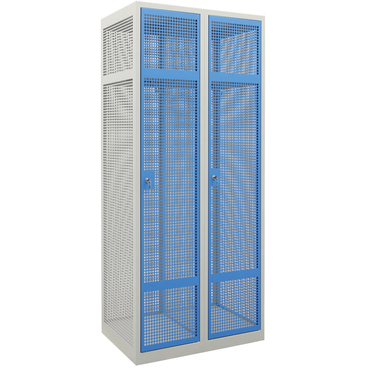 De gaasgarderobekast KTST 180-2.2 is een robuuste, volledig gelaste staalconstructie met twee afzonderlijk afsluitbare compartimenten. Dankzij de open gaaswanden en gaasdeuren blijft de inhoud voortdurend zichtbaar en optimaal geventileerd, een belangrijk voordeel in omgevingen waar hygiëne, luchtcirculatie en snelle controle gewenst zijn, zoals sportfaciliteiten, werkplaatsen, scholen en industrie.
