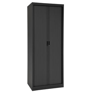 De kast is voorzien van kunststof roldeuren die volledig verdwijnen in de zijwanden, zodat er geen rekening gehouden hoeft te worden met openslaande deuren. Het stalen corpus is stevig uitgevoerd en afgewerkt met een krasvaste poedercoating. Voorzien van een cilinderslot met twee sleutels en standaard geleverd met vier in hoogte verstelbare legborden.